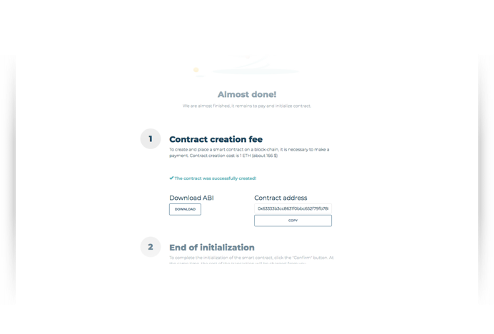 In technical terms, ICO Constructor is a specialized software designed to create new smart contracts according to user-specified parameters. The process of creation and configuration smart contracts takes place on the platform`s website using a convenient and intuitive interface. After confirming all the parameters, the user pays for the platform services, after which the platform automatically publishes the contract created by the user on the Ethereum blockchain. The owner of the new contract becomes the wallet that was used to pay for the services of the platform. The owner gets the opportunity to manage the contract through the platform`s interface.